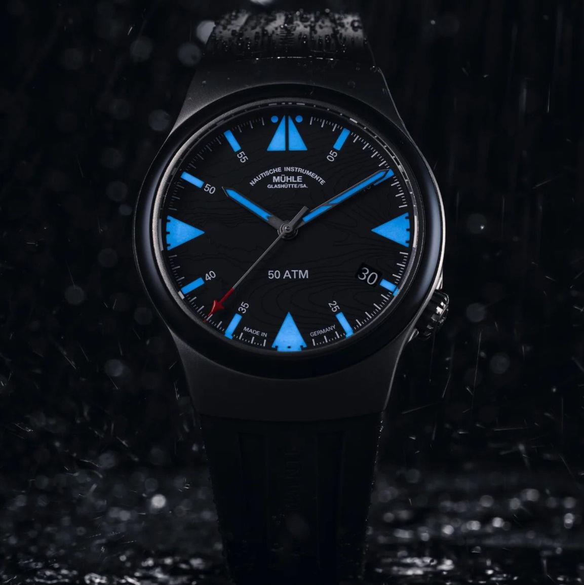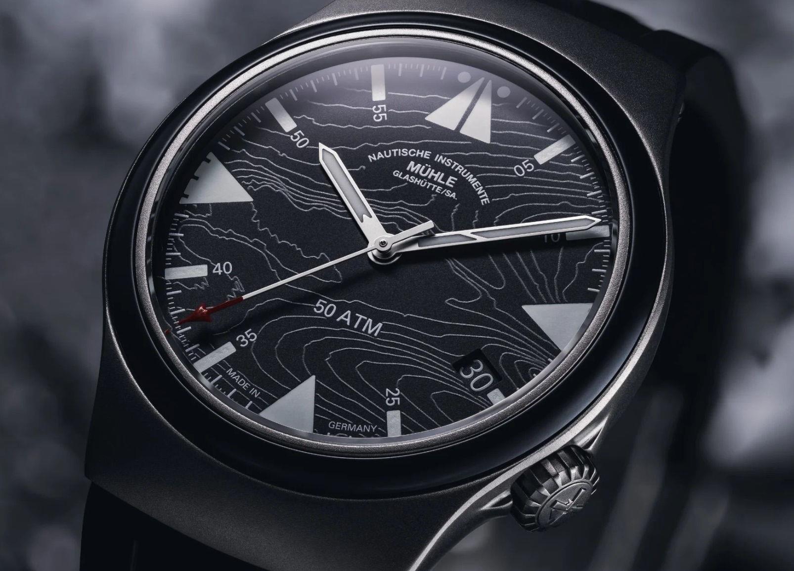• Black color super-luminova 5 minute/hour markers textured with topographical isoline dial.